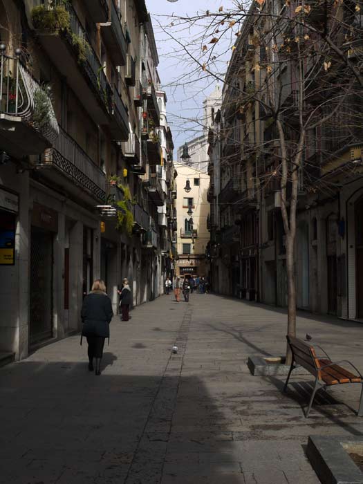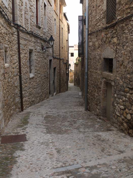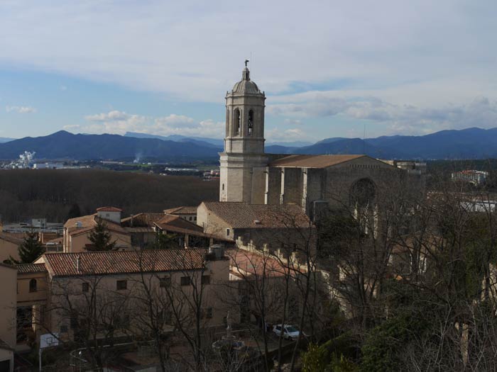 From the train station Girona looked just like a smaller, less urban Barcelona – apartment buildings and businesses lined the major boulevards. But our goal was the old quarter on the far side of the river where the skyline is dominated by two big cathedrals and long sections of the original city walls still remain. We walked along Carrer Barcelona before randomly choosing a right turn that led us to a small bright red steel bridge to the other side.
