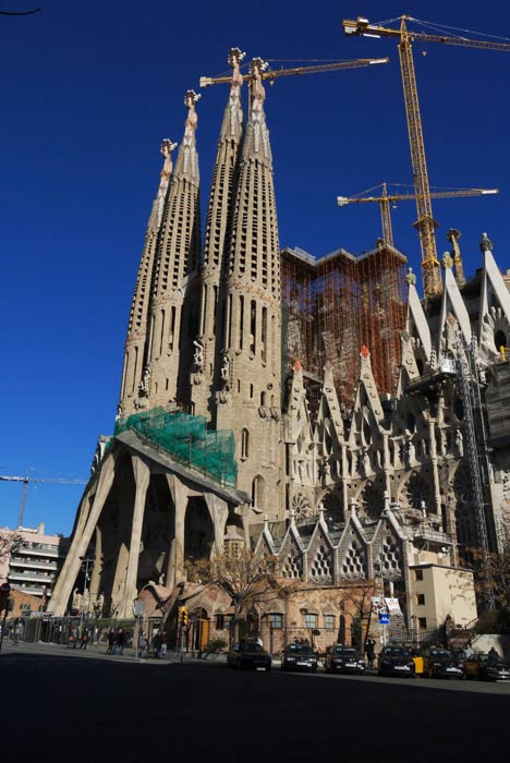 Turning off we began to see the cranes associated with Sagrada Familia poking above the apartment blocks. This complex has been under construction for more than 100 years, even now being only partially complete. Rounding the corner it became obvious as to why – it was enormous, taking several full city blocks and soaring hundreds of feet in the air.