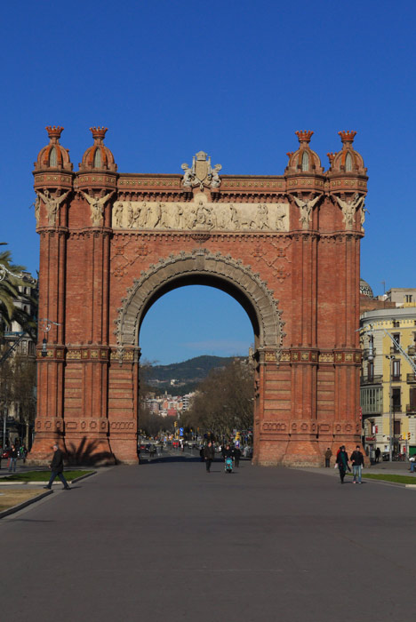 On the far side of the Barri the neighborhoods become less exotic and perhaps more characteristic of how people actually live here. Neat little blocks with small parks and playgrounds finally gave way to a broad palm lined plaza bordered on one side by the Palau de Justica and on the far end by the Arc de Triomfe which nicely framed the hills at the northern edge of the city. Whimsically baroque lamp posts, far fancier that what would be needed to do the job lined both sides of a broad promenade.