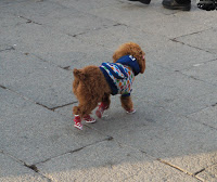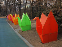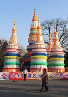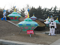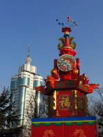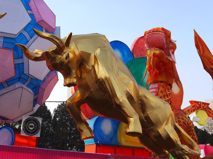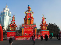 It was an interesting set-up and comparable in spirit to the Harbin Ice City except that these sculptures were made of wire painted fabric and ping pong balls instead of blocks of ice. I suppose it’s a spectacle after dark when everything is lit up, and it wasn’t bad in the late winter afternoon light. We wandered past stalls selling food and trinkets and marveled at the constructions in a chintzy sort of way. Yet another mélange of Eastern designs mingled with Western pop culture ranging from 100 Little Mermaids forming an arch over a walkway to dozens of little space ships and robots malingering at the top of the hill. They even had a ski slope with virtually no vertical drop consisting of an inch of icy slush and a t-bar rope tow. Everyone was drinking it in and taking lots of photographs, particularly on the bronze zodiac sculptures under the Mermaid arches.