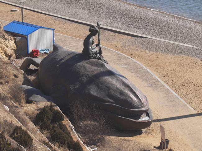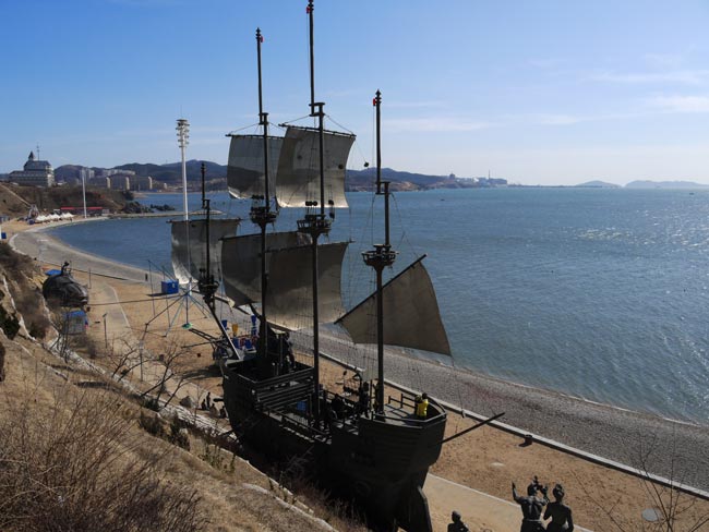 The Chinese love whimsical things and this beach is loaded with them – a pirate ship, a giant conch shell, a mermaid and a woman astride a Blue Whale. I took a few pictures and moved on it was very windy and exceedingly cold. Off in the distance cargo ships sat waiting for their turn to come into port. A large double-decker ferry steamed out of port on its way to somewhere. The giant spider arms of a container port stood out against the skyline of Dalian far beyond.