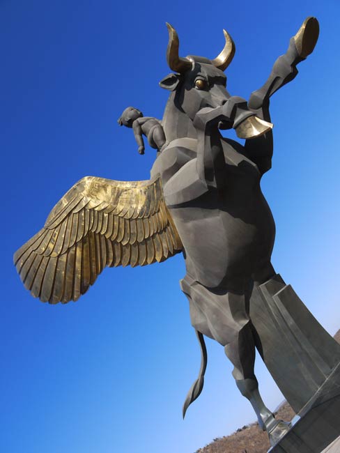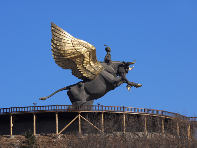 Today I thought I would hike up to the base of the UFO hill where there is a pretty big bronze statue of a winged ox with a little kewpie kid on its withers The park is called Tong Niu, 童牛, which translates literally as “boy oxen” which is exactly what the statue is. I’m told that there is a legend, but I’ve not been able to find anything out about it.