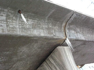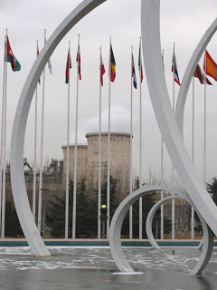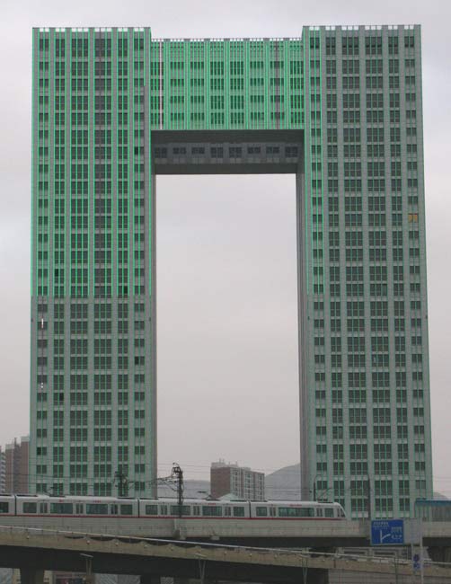 I turned around at a park by the road that comes into Kai Fa Qu. And interesting spot with stylized Olympic Rings framing a coal fired power plant. Flags of the world snap gaily in the smoky sea breeze. Across the street stands a big office building that lacks a center. At night it’s a blaze of color shifting neon. This time of day it’s merely green. Walking back I watched a boy picking up the remains of giant icicles that had fallen from the underside of the elevated train tracks running above the sidewalk. Looking up it made me wonder what it would be like to have that chunk of ice plummet onto your unsuspecting noggin.