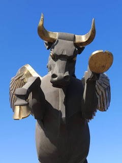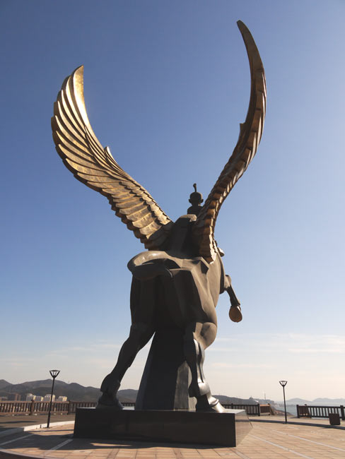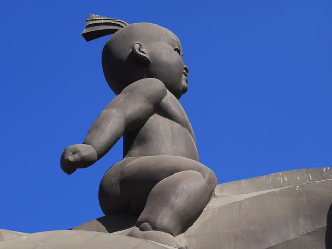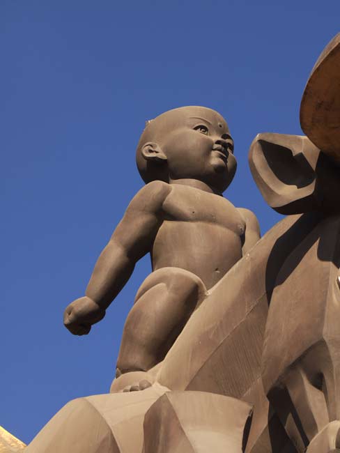 The Ox is pretty impressive from up close – polished hooves and wings and a look of determination and anger on its face. The Boy sits astride also with a look of determination, his little topknot flapping in the wind. He has the mark of the Third Eye on his forehead, making me wonder if this has some root in Buddhism but I can’t be sure. There is a plaque but without translation. As it is with all things like this, from below set against the sky it looks much bigger than it really is. Not unlike the full moon rising in a supercharged size only to shrink more and more as it reaches its zenith.