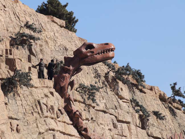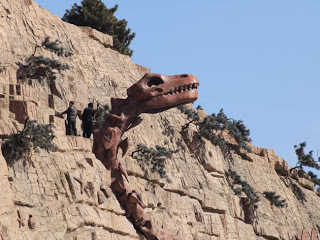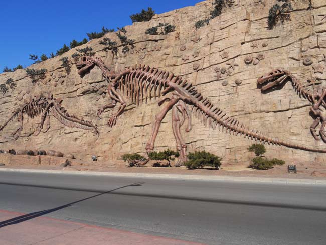 Across the street from me a long line of dinosaur skeletons marched in the opposite direction formed by carved concrete on an exposed rock face. Some teenagers had climbed up to the highest head, standing on a little ledge with no railing fifty feet above the road below.