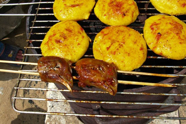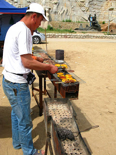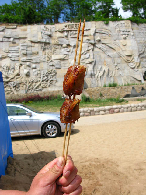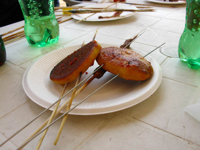 One of my guys had done a little research and enlisted his driver and housekeeper to pull together some food and entertainment. We had a nicely sized half a cabana with tables and chairs. A group of Chinese celebrating a birthday shared the other half. It was interesting to hear them sing “Happy Birthday” in Hanyu. Some grills were set up and when we arrived the first of the food was ready – pork pieces on bamboo skewers, my first opportunity for street food albeit in a slightly controlled situation. It took a while for the party awkwardness to abate but eventually everyone sat down and munched on the meat and talked about things of mutual interest – cameras, software – a genuine cross-cultural geek-fest. Hot on the heels of the pork were some very spicy chicken wings followed by some beef skewers and then little round cornbread pancakes swabbed in Chile sauce. These turned out to be my favorite.