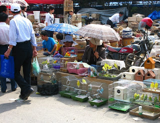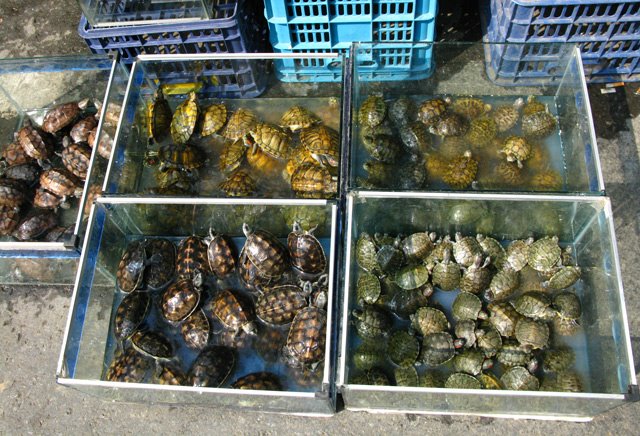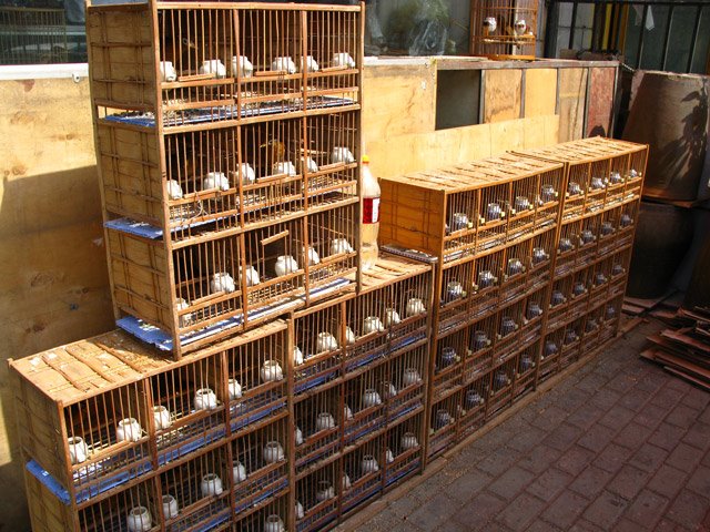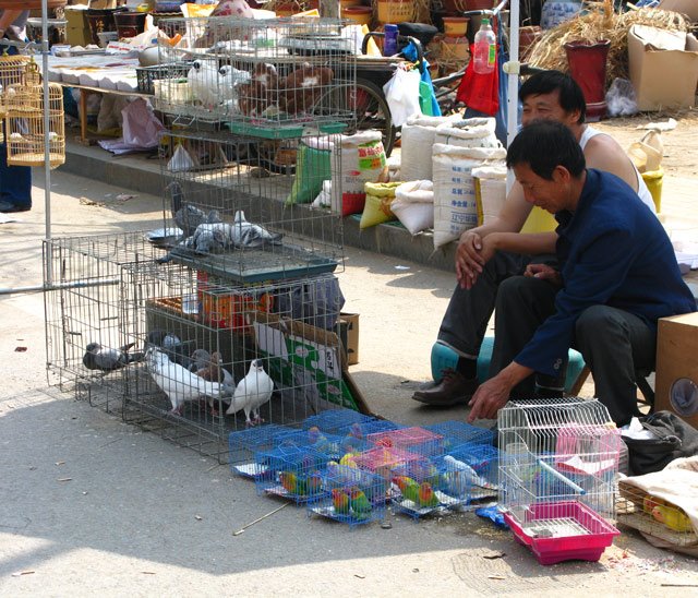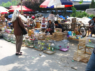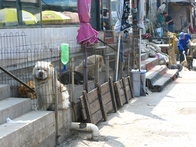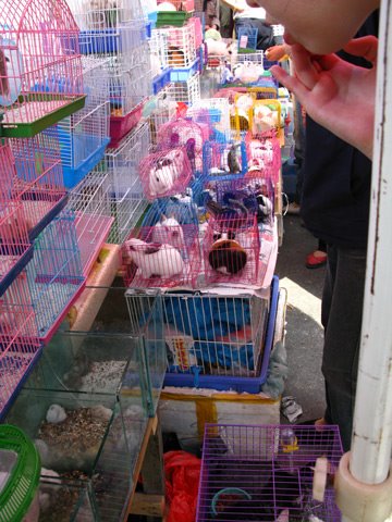 As always it is tough visiting places like this due to the way the animals are kept. A flimsy wire enclosure held a half dozen overheated and lethargic Chows. Kittens slept curled up four to an uncovered box in the sun. Dozens and dozens of birds were jammed in tiny cages. I found one shop selling Thrushes in the traditional wooden cages you see in the parks of Shanghai, but these were dirty and tired. I suspect that having a singing bird in the house is a grand thing for people here, just as it is throughout the third world. But I don’t think they get into the same cultural rituals that you see among the men in the parks down south. Fish were sold in baggies nailed to a makeshift wooden frame.