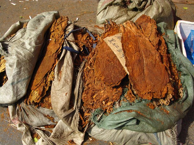 The junk salesmen were aggressive despite the fact that there was nothing appealing to buy. From one blanket, someone was selling every old television remote known to man. At another, stereo cables. One group of guys sat playing American pop tunes on those strange Chinese guitars made from two steel strings and round tube of bamboo. The instruments were reasonably priced and I was tempted to pick one up, just for fun; perhaps on another trip. Three dried animals of indeterminate type lay sunbathing on a small scrap of cloth in front of a truck. It was really hard to imagine what they looked like in life – they could have been anything from an otter to an alligator. The seller came over and talked to our driver and the shaky consensus was some sort of lizard. Their heads looked remarkably like the beast in the Alien movies. Some sort of Chinese medicine supplies I suspect, because even as jerky, there wasn’t enough meat on them to bother with. Interspersed amidst the junk and the animals were a few interesting stalls including two selling dried broad leaf tobacco – the smell was enticing. Another sold sex toys with particularly graphic labels. I did get into a bargaining argument with a woman selling a bronze Mao, she being stuck on 150 and me going no higher than 100. Surprisingly, she let me walk.
