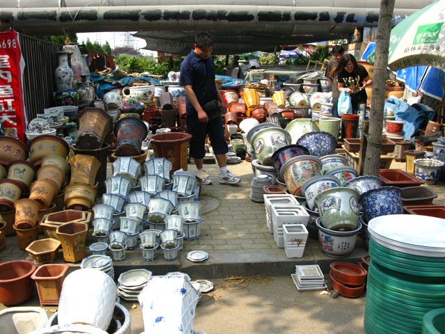 I went back outside realizing now why the market only exist s on weekend mornings – it was damn hot. Most of the sellers sat there under umbrellas or folded pieces of cardboard, trying to catch some relief from the sun. Off in the corner young man beckoned me over to peruse his “genuine Ming Dynasty vases”. I did find one I liked and inquired about the price, 400 Yuan, down a bit from the 8000 I had been quoted on everything else. I’ve changed my bidding strategy recently, I simply start absurdly low and I don’t move too much. If they don’t want the money, they can carry the thing home. I countered with 100 and he went into the standard spiel about how he knows my friends and that he has always given them a good deal and that he really, really wants to do the same for me. 100 though was just too low, how about 300? I went to 150 and walked away. He grabbed me and pantomimed tears running down his face and his poor sad child having to attend public school before countering with 180. Fine, deal done; he wrapped the vase up in a couple of plastic bags that were oddly wet – never a good sign – shook my hand and sent me on my way.