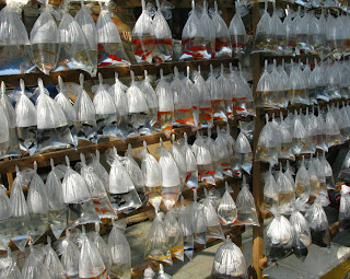 I wrapped up my visit here with a quick spin through the fancier aquarium supply alley. Big tanks lined with deep turquoise paper holding hundreds of bright orange Koi slowly swimming back and forth created a mesmerizing visual display. In one, a tank of orange fish on the bottom and top of the pile were kept apart by one holding long silver fish. In another place something this simple could be called modern art. The shop next door had tanks lining the walls each divided into separate sections of fish sorted by colors – black, brown, blue, green, yellow, orange, red, white – at first glance you wondered why they were not mixing.