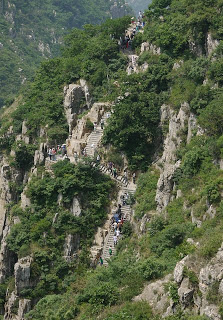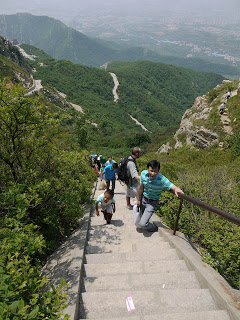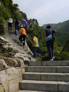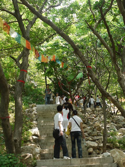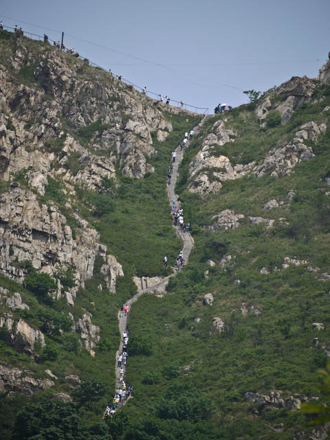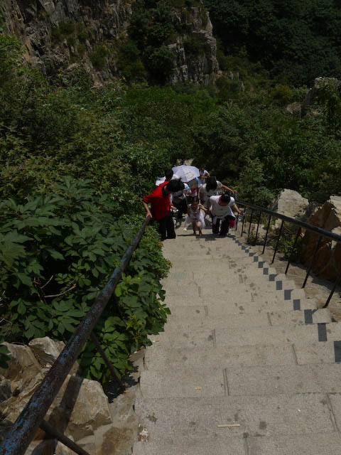 Having recovered 20% of our strength we started off again up the road to the stairs and reaching the base we realized a miscalculation – we’d made a bad turn somewhere and these were not the gentle stairs hugging the hillside. These were stairs that came out of a ladder factory but not daunted, we forged ahead, leaving poorly prepared Chinese in our wake. I will mention here that the Chinese do not prepare well for these kinds of outings. Most are carrying some sort of big snack like a loaf of bread along with a couple of Cokes in a plastic shopping bag. The women wear high heels and the men wear bedroom slippers with the heels tucked under their feet. None of them are wearing clothes for the effort; the women use umbrellas to keep cool and the men roll their shirts up to their arm pits.