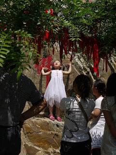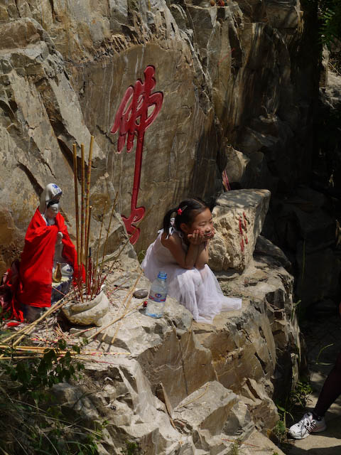 Finding the path out of the temple compound, we had our tickets checked again and then up and up we went, eventually reaching a switchback that housed a tiny shrine. A man stood in the shade selling red ribbons to tie to the tree – another prayer offered to a local deity. A cute little girl in a miniature prom dress climbed up on the shrine and stood there hamming it up for her adoring family.