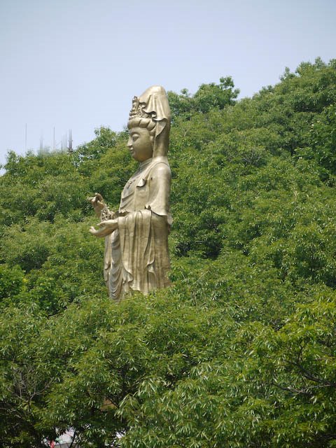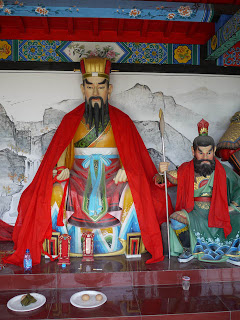 Behind this statue was a large cubic building topped with a large golden Guanyin, looking out over the valley. We wandered off into the woods and found yet another small shrine containing three of the less strictly Buddhist statues. Two small plates had been left as offerings, one with leeks and the other with two eggs.