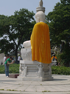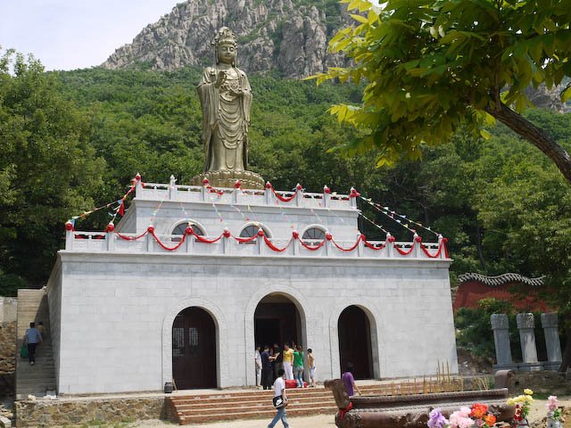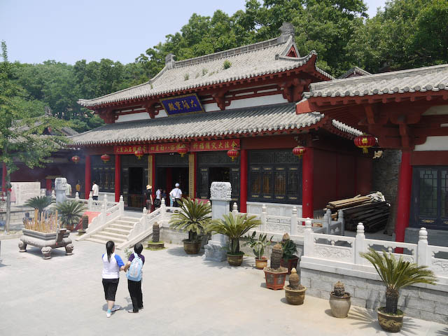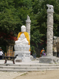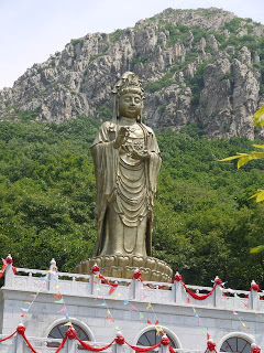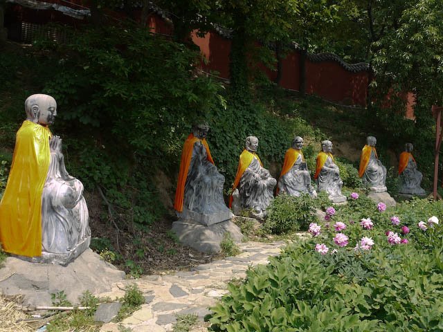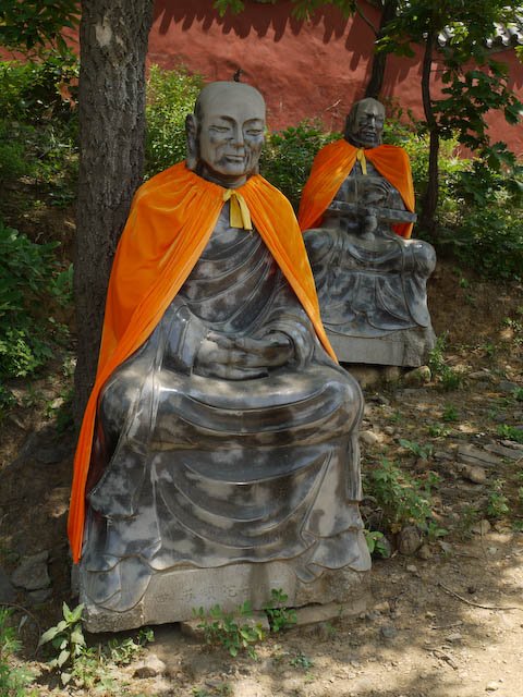 I paid the 20 kuai admission fee, collected our tickets and we were on our way. The stares began almost immediately, this being another one of those places that westerners simply don’t frequent. There is a new temple under construction just above the parking lot so we wandered in. The statues here were different than those I’ve seen in the past and I am wondering if this is one of those synthesized religious sites that counter the pure Buddhist presence in China. The most popular religion here in the north is an amalgam of Buddhism, Confucianism and the country-based Animist traditions. The few monks wandering around in the temple halls wore white pants and short black jackets with those traditional Asian button and loop fasteners. They also wore caps that brought to mind those worn by the holy men at the Shinto temples in Japan which got me to thinking that they might be throwing in that here as well. There is still quite a strong Japanese influence here in the north, and I suspect we were seeing some of that here.