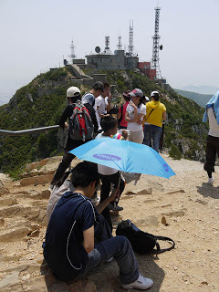At the highest point, there are some cell phone or communications towers, listening posts I’ve been told. From our vantage point we could see another set of stairs heading up and they didn’t appear to be nearly as steep as the last set so off we went in search of the base. The initial climb on the road was tough – it was steep and getting hot. We stopped for a break at an overlook that had a nice breeze and enjoyed the view. A steady stream of Chinese offered more “hellos” as they passed, heading in both directions. Aaron stretched out and I sat watching the people. I glanced off to my right and caught a young woman who had been sitting next to me on the low wall now standing across the road taking our picture with her cell phone. She saw me seeing her and turned face and scurried off laughing. I asked her if she was taking my picture and her friend began to giggle uncontrollably, confirming my suspicion.