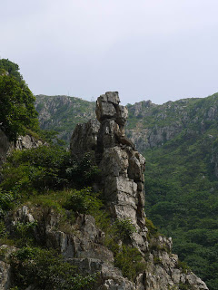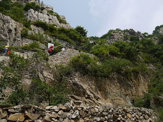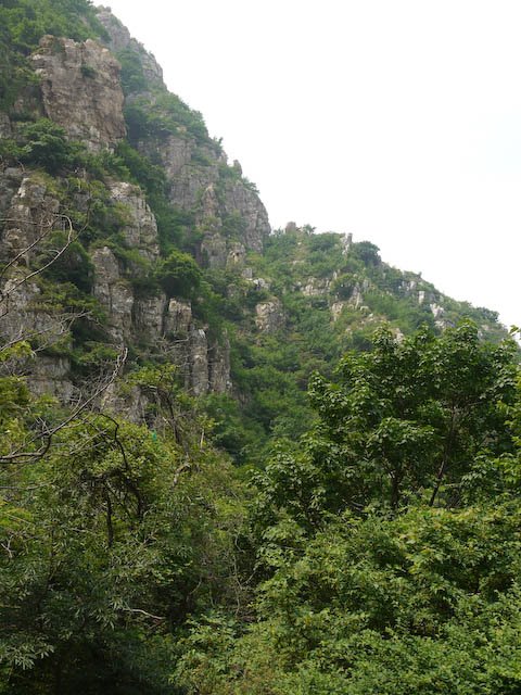 You ascend the mountain via a narrow and deep valley in the rock. Between the vegetation and the landforms, you could easily be dropped here and think that you were in either Sabino or Nacapule Canyons back home. Short Live Oaks, or the Chinese equivalent, dominated the flora. Birds sang in the trees but there was no watching them from here. You see, Da Hei Shan has a dark secret – you climb it via hundreds of narrow stone stairs built for size 6 shoes, not big boys with size 10+ sporting lugged soles. No, you didn’t look around, you watched your feet or you end up on your face.