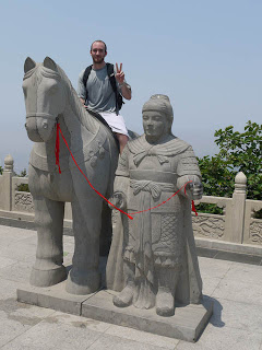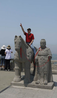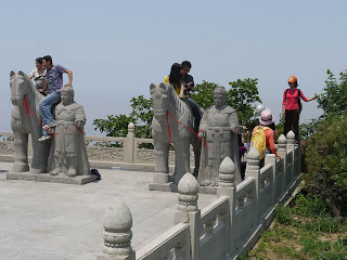 It was a nice change to walk along the flat saddle here at the top. Up a few stairs we found some marble statues of soldiers and horses and following the lead of the locals, we climbed up and had our pictures taken.