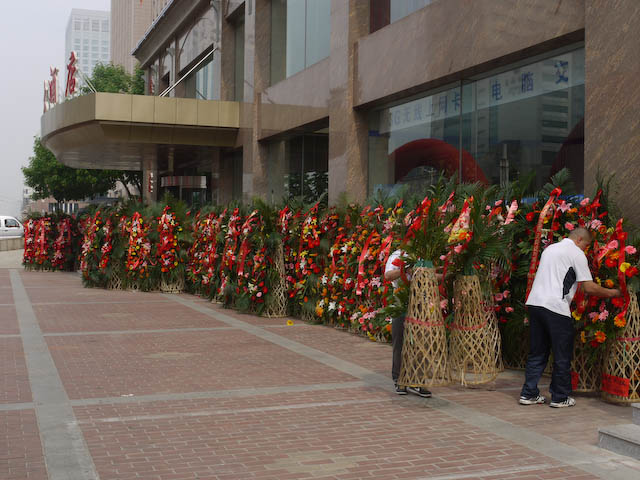 The view was incredible – the ocean in both directions, Kai Fa Qu, Dalian and Jinzhou spread out below. It would have been really nice had the smog not almost completely obscured the detail. Off in the distance was a steady barrage of fireworks, this being a big wedding day smack at the beginning of the big wedding season. In fact I had passed the fixings for one on my walk to Starbucks that put last Saturday’s event to shame. Twenty or more fireworks cannons, three giant red arches, more than 30 flower displays and uniformed guards shuffling the pedestrians on their way. The sounds of fireworks that would normally send an American running for a better view are completely ignored here – they are just so common.