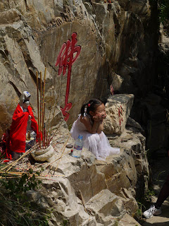 Midway up we came to another temple, this one quite fancy and a little more Buddhist in its representation. A guard was checking tickets at the entrance which set me to scrambling to find mine, and making me wonder how anyone could have gotten here without one. Some backcountry trail perhaps. There were four buildings around a center square and the incense smoke was thick and sweet. I went to each temple and visited with each Buddha. Off the side of the main plaza was a large Buddha done in white marble with a giant yellow cape draped around his shoulders. Surrounding him back the trees were smaller stone carvings of various monks, each sporting his own bright yellow cape. Very similar to the Hill of 100 Monks I visited back in November, only the clothing on these statues was fresh and the colors were vibrant, not sun-bleached and tattered like those at the other site.