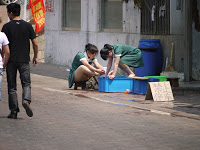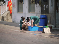 Completely unrelated to this story, I wanted to add a couple of photos I took the other day following our hike up Da Hei Shan. The cab dropped us off by our favorite western restaurant – The Real Eddie’s – and we hoofed it down the alley to his place, a Philly Cheesesteak in mind. Walking along the backs of other restaurants we passed these two young women, waitresses about to go on shift, out back washing their feet and giving themselves pedicures in tubs of dishwater. I tried real hard to think about how the local restaurant reviewer in Albuquerque would handle such a thing and couldn’t come up with anything. Offended or amused, I’m not sure. Here though it was just another one of those funny little things you come across when you least expect it which is honestly, all the time.