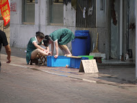 Now that the weather is nice, the sidewalks are jammed with street vendors selling fruit, ceramic Santa Claus butter dishes, ocean going container ship models built from plastic pop beads, women’s knee high stockings, Hawaiian print short shorts and today’s special, travel sized packs of Kleenex. The one food item that caught my eye was some sort of dough based treat that looked a lot like the cinnamon crispers you find at fairs in the Southwest. Kind of a pale brown ribbon. Well here the ribbon was being dispensed from a dough press and the operator was taking up the output and folding it into small piles. The interesting part though was the means by which the thing was running – a small diesel engine belching oily gray smoke through an exhaust pipe over the dough ribbon output. These kinds of distractions make navigation kind of tough, but the booming disco beat coming from the stores helps to keep you focused and moving forward.