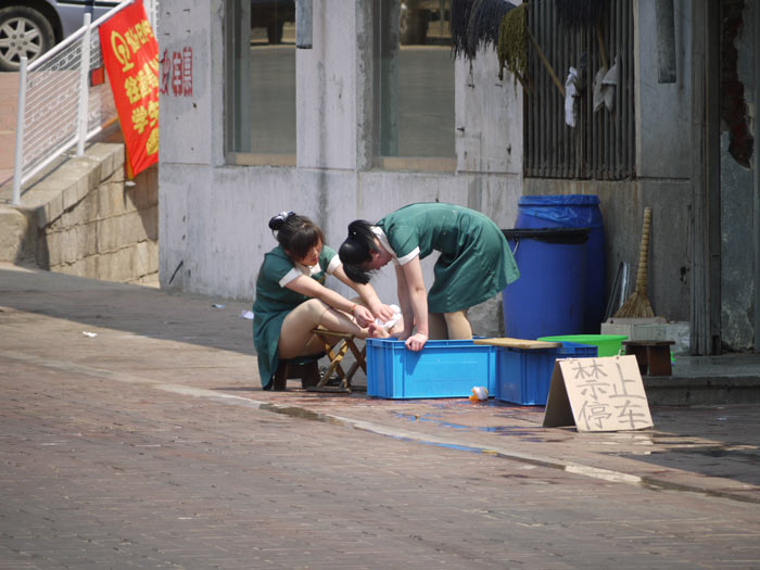 Completely unrelated to this story, I wanted to add a couple of photos I took the other day following our hike up Da Hei Shan. The cab dropped us off by our favorite western restaurant – The Real Eddie’s – and we hoofed it down the alley to his place, a Philly Cheesesteak in mind. Walking along the backs of other restaurants we passed these two young women, waitresses about to go on shift, out back washing their feet and giving themselves pedicures in tubs of dishwater. I tried real hard to think about how the local restaurant reviewer in Albuquerque would handle such a thing and couldn’t come up with anything. Offended or amused, I’m not sure. Here though it was just another one of those funny little things you come across when you least expect it which is honestly, all the time.