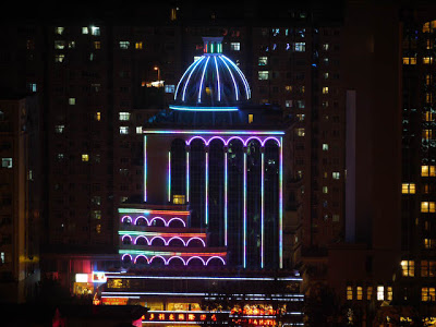 The Victoria Hotel at night, never ending neon lightshow, the tubes run until quite late, red – green – blue – white.
