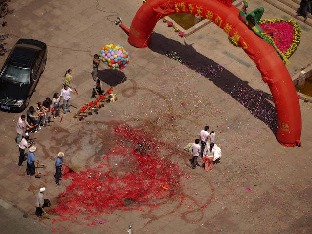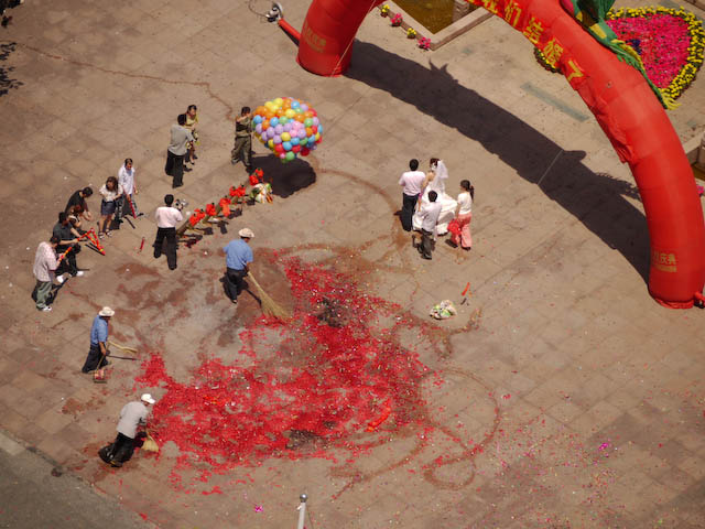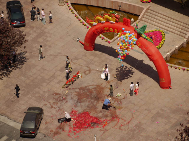 Wondering about the racket I got up and looked out the window – the bride and groom were in a white stretch Lincoln limousine, the videographer was leading in a red convertible and blocking the rest of Jin Ma Lu were the 10 or 15 black sedans forming the wedding party. Traffic was backed up for blocks while the procession sat and waited for the fireworks to scare off the evil spirits. My Lovely Wife told me to go and lock myself in the bathroom to lessen the din, but it’s not an option – my building is 100% poured concrete and my Wi-Fi signal is only strong enough to maintain a Skype connection within 6 feet of my router. Since I couldn’t hear I decided to take some pictures.