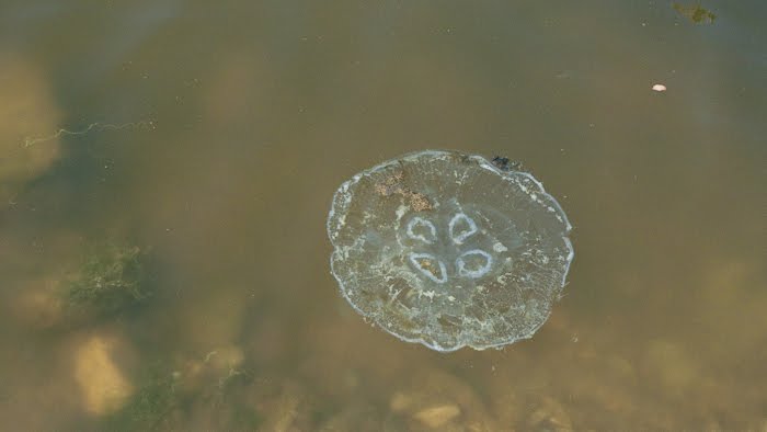 One day last week the water was pouring in like crazy and the surface was covered with jelly fish – no doubt sucked into the canal and carried over the top of the bladder. Black-tailed Gulls were skimming and dipping out any edible pieces of the poor things that were almost certainly doomed to end up on the bottom.
