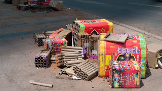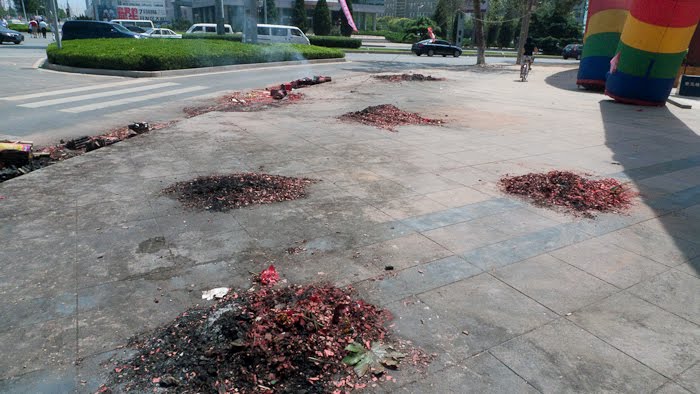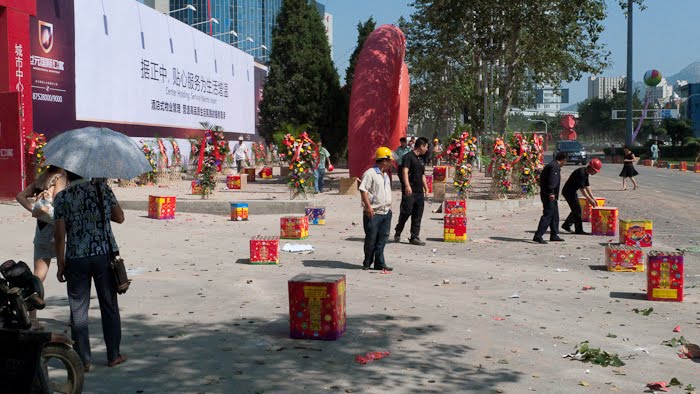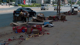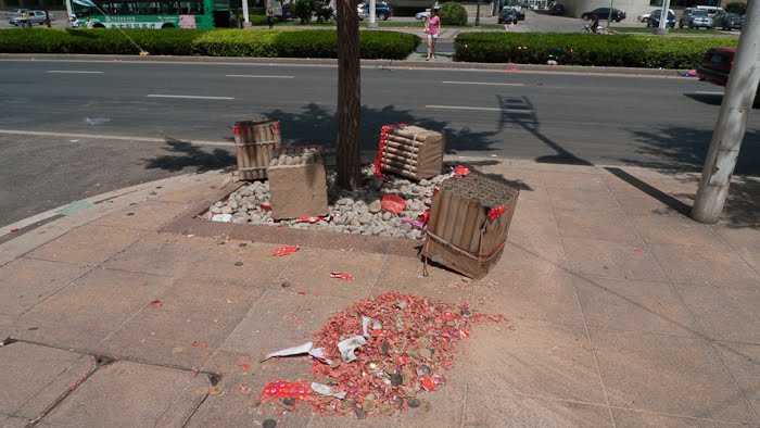 On August 8, the owners of the luxury apartment building going up at the end of my block decided to scare off the evil spirits with a grand fireworks display. I happened to get back from a ride about midway in the event and I took the video during it and these pictures and hour afterwards. All the workers came down from the steel beams and all the pedestrians stopped and watched, covering their ears for the noise. When it was over, everyone went back to work and the passersby went back to passing by. As the cleaners tidied up the sidewalk, the occasional firecracker would go off in one of the smoking piles.