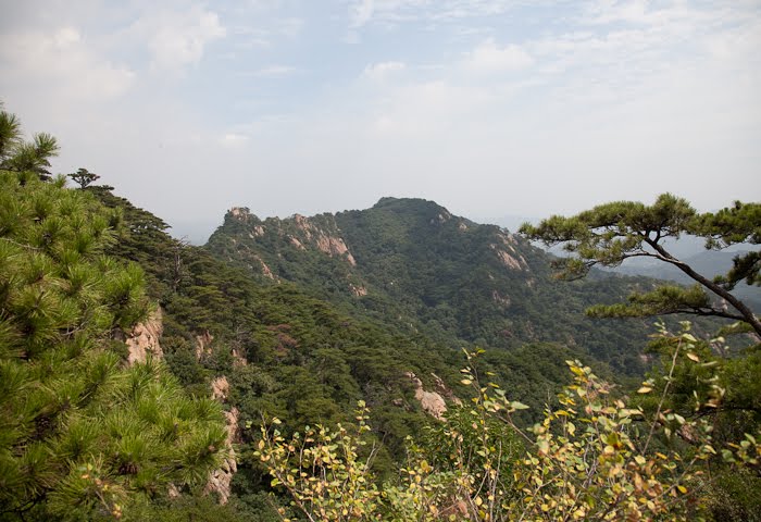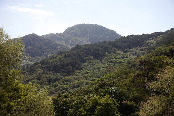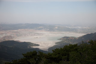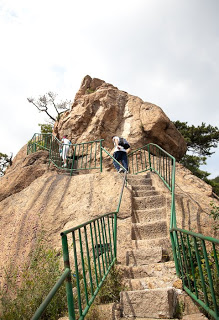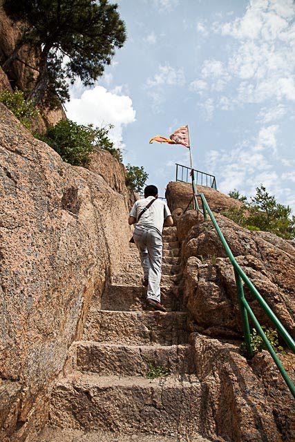 We climbed quite a ways before leveling off at the top of the mountain. The view to the west was of Anshan and what appeared to be a giant strip mine. The rest of the panorama was of the park and temples could be seen peeking out of the forest on ridges high above the valley. The wind was howling and the temperature was thankfully much lower. Three stone saints stood facing east, cloaked in bright yellow capes. Jiang lit an incense stick and prayed. I wandered around in what little flat space there was, taking photographs and enjoying the sights. After a bit we headed back.