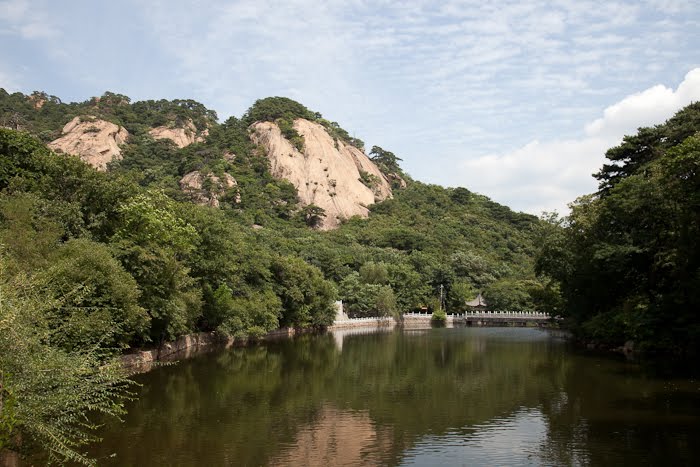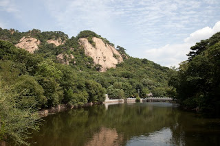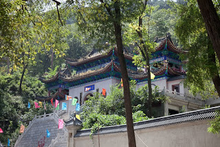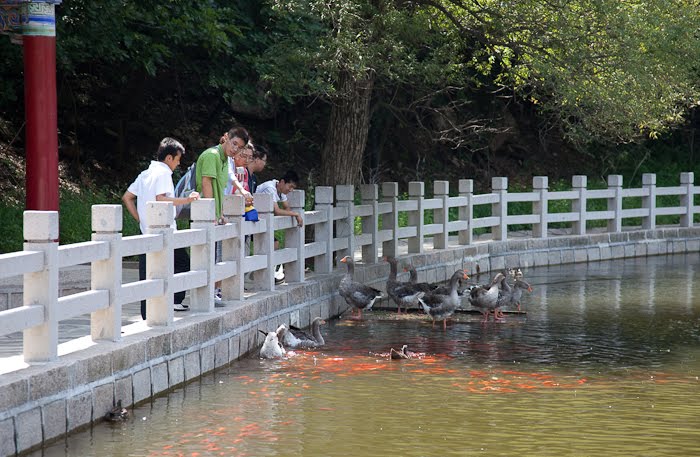 At the midpoint of the hill a stream had been dammed to create a lake that teemed with big bright orange and black koi. Visitors were feeding them and a pack of geese that was horning in on the action. At the head of the lake the stream entered over a series of small rapids where people were alternately cooling off their feet and filling their water bottles. We walked on along the shady road taking in the sights and beginning to feel the effects of the heat. Jiang asked if we could sit down for a few minutes, I figured he was tired but it turned out to be time for a cigarette.