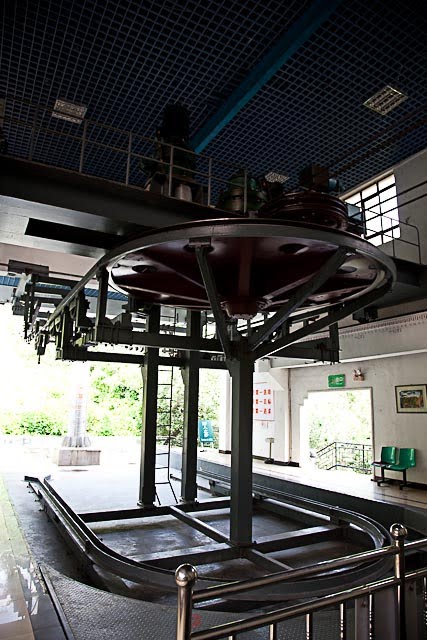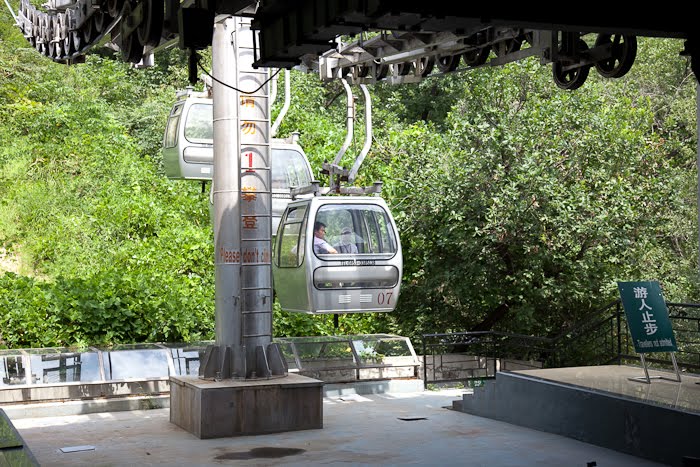 The ticket sign did not bode well – 30 Yuan for a 1-way ticket and 1 Yuan for “insurance.” I paid for us and we climbed up to the boarding platform. Our short wait ended when three tiny silver cars rumbled into the station. The downward bound riders jumped out quickly and we climbed in as the cars continued their way around the giant cable return wheel. Jiang and I jumped in and helped a young couple join us. The doors automatically closed as we cleared the station and when they did, the heat inside our capsule rose like a rocket. In a manner of moment it was like riding in an oven. We began our ascent and started to sweat.