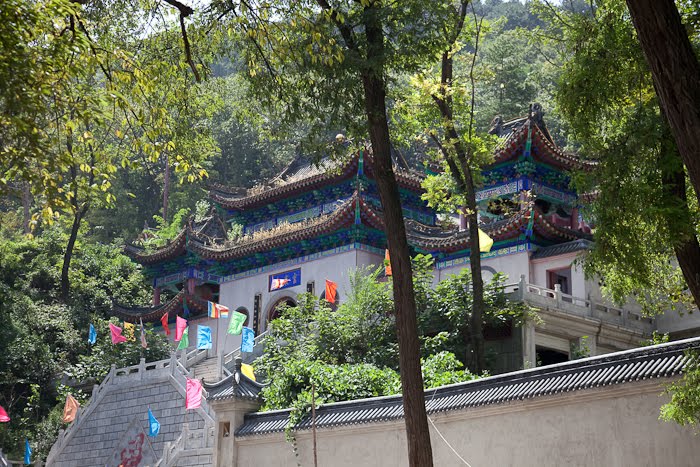 Despite the gnawing fear the view was spectacular – pointy peaks spread out across the horizon. On the opposite side of the valley I could see the spire of the golden pagoda that I’d spotted from below. The trees here changed from leafy to pine and a pair of Jackdaws rode the thermals along the ridge top croaking away. The general landscape looked very similar to our Southwest – pines, junipers and exposed orangey rocks. The ride took perhaps 15 minutes and we did the same scramble to get out of the car that we’d done to get in; it was nice to be out of the heat. A short walk through the woods and we found ourselves at 5 Buddha Peak.
