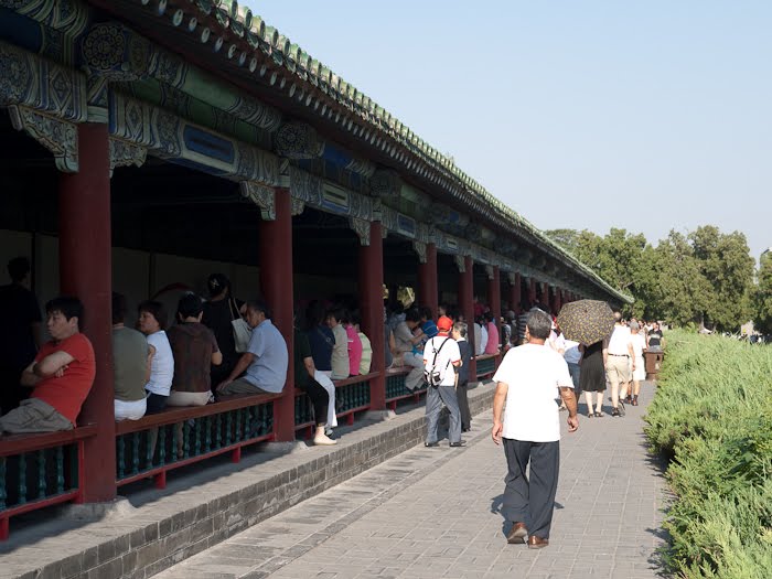 There were three parallel roads leading inclined with ancient cedars and pines. Black-headed Magpie Jays were gliding from tree top to tree top, calling their raucous Jay calls. Off to the left traditional Chinese music was playing and a crowd had gathered, fan dancing ala Dalian I suspect. I headed on eventually reaching the outer walls of the main temple. Here, long covered corridors wrapped the outer walls of the temple complex – coincidentally called “The Long Corridor” according to a sign –they were crowded with people. Waiting in line or just hanging around, I was not sure until I heard the singing – small choirs were singing traditional Chinese songs and the crowds were watching them and in some cases singing along. One tune caught my ear – a throwback to my childhood, it was known then as “Midnight in Moscow” and was performed by Kenny Ball and his Jazzmen. It had been a Top 40 hit in the days before the Beatles changed everything and I really liked it, being the oddball little kid that I was. It had words here though and it occurred to me that it probably was some sort of Communist era anthem, co-opted by Kenny and the boys for the western market and their notion of what jazz sounded like behind the Iron Curtain. I walked along from song to song until I reached the entrance to the main square and the notion of “through ticket” became clear – you can buy entry to the park or the park and the buildings. I gave up my first stub and went in.
