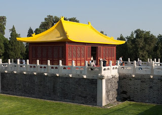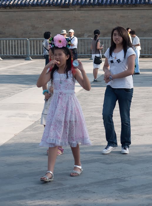 I went out through one of the main doors before I realized that it was an official exit. I turned around and snuck back in when the attendant wasn’t looking and spent some more time exploring until I figured I’d seen about all I could see. Exiting the second time I headed down the broad plaza passing by the building that was once used for the emperor to dress before moving to the temple to conduct his rituals. It had a yellow roof of a hue I’d never seen. Little girls were running around, each sporting a traditional hat that featured a giant pink chrysanthemum, no doubt for sale at the souvenir vendors up ahead. Up ahead was a round tower enclosed in a giant circle of stone. Surrendering a second tab from my ticket I went in to have a look. This one was interesting having once used to house the sacred texts that the emperor used to converse with the gods. It followed the same pattern at the main tower – support buildings to the left and right and a gate to the south that led to a tall, round stone platform used by the royal family for viewing the surrounding forest. All aligned to celestial north. A long line of people was winding up and down the stairs to see inside the main building but I decided to pass on that, choosing instead to take a break by the inside of the circular wall where people were testing its properties by standing far apart and speaking softly to each other – the wall was such a perfect concave mirror that their conversations were carried along its arc.