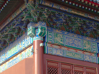 One of the amazing aspects of this period of Chinese architecture was the sheer volume of empty space. The main tower stood at the center of a huge main square paved with gray stone and hemmed in by a short wall topped with shiny green tiles. The temple stood to the north and supporting buildings were due east and west. To the south another building housed giant doorways beyond which another empty square led to the next set of buildings. I wandered around taking picture and people watching which by all standards was pretty amazing. I wandered up the steps and took a look inside the building itself – a soaring, intricately painted roof was supported by massive wooden columns painted red with gold ginko leaves embossed on their surfaces. Taking a decent picture here was tough due to the number of people and their seemingly intentional movement directly in front of me each time I framed something up.