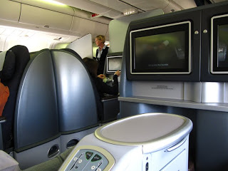 I sat between two sleeping businessmen and My Lovely Wife looked out the window. The flight is advertised as 90 minutes but being 288 miles it really only takes 45. The remainder comes in the form of the endless walk once on the ground in Heathrow. More tunnels, more tubes and more moving sidewalks. We got checked in, corrected the incorrect check-in to put us in 1st class on the second leg and settled in to wait in the lounge.