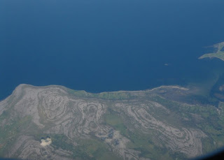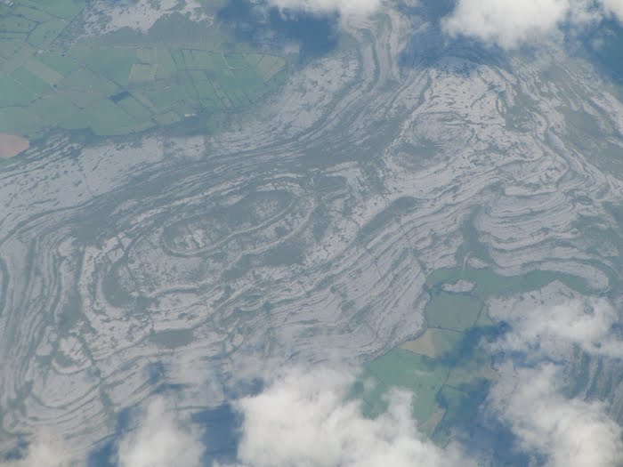 Looking out the window I had a great opportunity to compare the geography of England and Ireland – same little crazy shaped fields bordered by walls and hedges with roads winding between them, following no particular path. As we crossed the western edge of Ireland and out into the Atlantic, I had a great view of the Burren, that odd limestone landscape we’d been driving around in only days before. From the air you can get a good sense of how really strange it is – vast tracks of stone with no ground cover forming whorls and whirls of gray rock against the otherwise emerald green land. Galway loomed off on the horizon and our path took us straight over the Aran Islands, invisible this time not due to weather but the wings of the airplane.