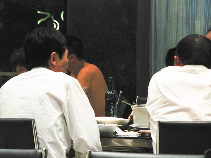 At dinner last night I had one of those amazing sightings – a Chinese guy with his shirt off. Men’s exposed skin is something all too common around here, every day when it’s hot you see guys walking down the street with their polyester polos rolled up under their man-bosoms and usually their physical condition does not merit such an outward display. But a guy stripped to the waist in a restaurant is somewhat more elusive (thankfully) and I had heard the tale but never actually seen it. Until last night when the guy a couple of tables over apparently thought the peppers were too hot and so stripped down. No one cared and no one noticed when I snuck a photo from across the room to provide documentation. “No shirt, no shoes, no service” signs have not made it here yet.