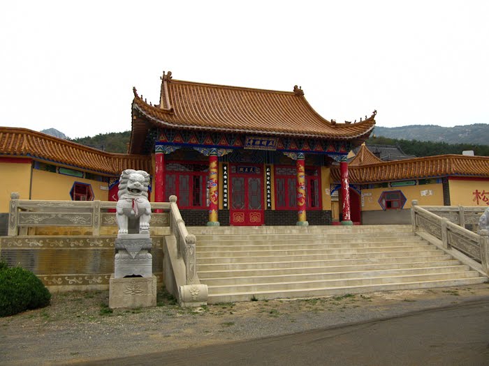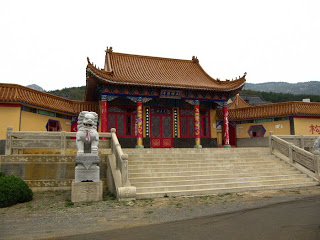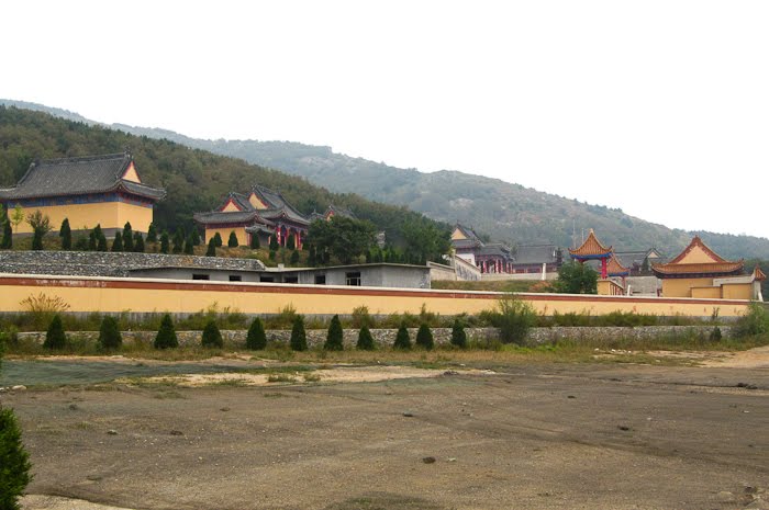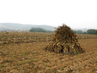 Up the road a bit Hui and Miao stopped us to have a look at a temple that was off the road along the side of a hill. They were talking with a woman who was tending to a pack of puppies in front of her house. They appeared to be the standard Chinese mutt, some kind of Pekinese or Pomeranian although one of them was a striking black and white and they couldn’t have been very old as they were very shaky on their feet. I told her the piebald boy was quite beautiful and she beamed with pride. We decided to go up the hill to have a look at the temple and the woman offered to watch our bicycles. I thought it might be better to keep an eye on mine so we took off riding first through along a muddy lane between a row of houses and then up a rutted dirt track through a field of corn stubble, big sheaves randomly piled here and there. It was a tough climb between the rocks and the sand and at top we turned onto a road that was covered with drying fishing nets. I wasn’t sure whether the owners were going to be very happy about us riding across them but we did so anyway, stopping in front of the main gate. A large dog stood there barking at us and woman appeared, tending the nets. She yelled at someone in the house to put the dog up and told Miao that the temple had been there only since 2006. There had been an older site up in the hills but the army came along and took it over so the villagers build a new one on this spot. We didn’t take the time to go in, it was enough to just have a look and ride back down the hill. Out on the highway, we were once again on our way.