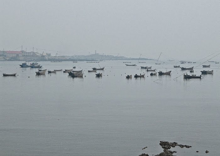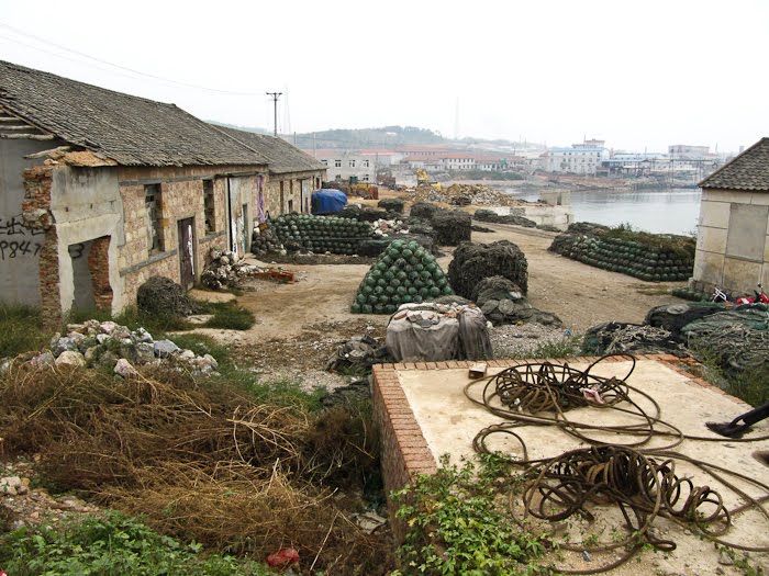 Each of these villages looked the same – rows of peach colored concrete buildings surrounded by piles of fishing floats, crab pots and drying nets. The shore was rocky and covered with empty shells and trash. The little bays were almost covered from side to side with those small, distinctive Chinese fishing boats – blue with square ends that turn up from the center of the boat. The smell was pretty bad, a mixture of rotting seafood and sewage that poured from pipes straight into the water. It was tough to stop even for a moment, the stench being that strong. I took a few pictures and moving on I was glad that the road took a turn inland for a while.