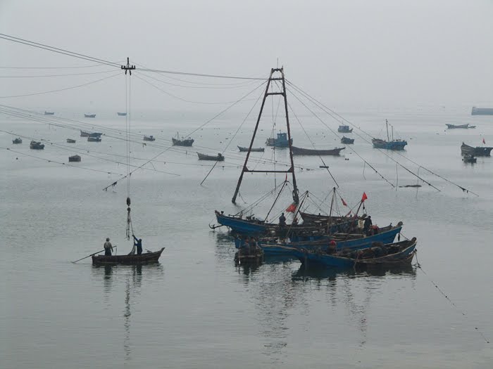The road hugged the coast and we passed through village after village dedicated to working the sea. We stopped in one for a snack and to watch a group of women in bright kerchiefs separating some sort of sea creatures. One of them was yelling something at me, I think suggesting that I take pictures of the crane and hoist system that was bringing big wet bales of fish from the boats off shore to trucks waiting on land. Hui told me that the woman liked me, I took a couple of photos and we road off as some sort of supervisor appeared in the doorway of the building no doubt curious what all the yelling was about.