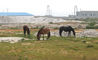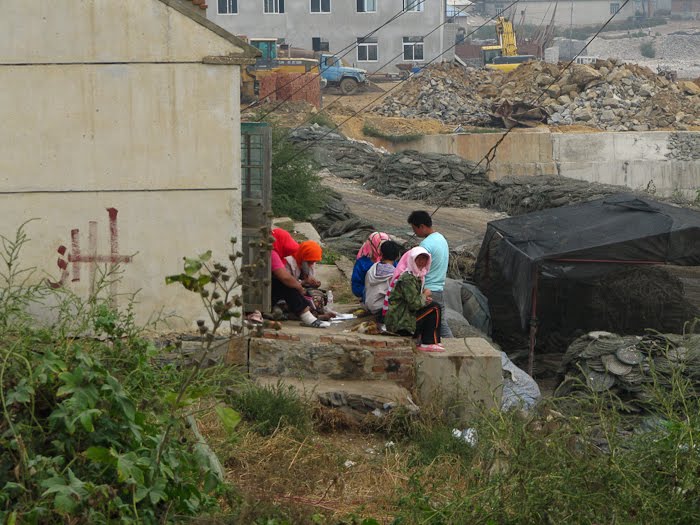We passed a short line of those concrete stanchions that seem to plague the central part of the province. I’ve been told that they are part of an ongoing construction project, building a high speed train line to Haerbin. But I’ve seen them all over the place in short runs, never more than a dozen pillars with a road bed connecting them and it seems an odd, sporadic way to build a train line. This bunch ran into a big building and stopped. It looked too temporary to be a future station, and yet it didn’t seem to have anything to do with the construction. I’m sure its use will become apparent someday.