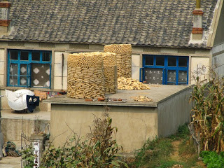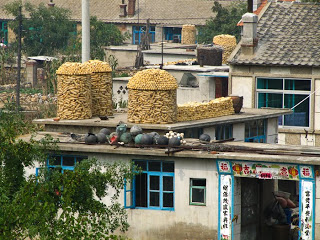 We were now at the point where we were trying to decide when to turn around since we were on an out and back ride. Each major descent of the road meant a big climb on weary legs so we decided this was the spot and so we grabbed one last banana and turned around. The dog village was empty on the second pass; apparently they had found amusement elsewhere. I stopped here to take some pictures of the season’s corn harvest drying on the roofs of the homes. Along this stretch the same purple Asters that come into bloom back home were showing up in clumps here and there. It’s a funny thing to see the same plants growing wild halfway around the world. It creates some sort of small connection to the things you love and miss.