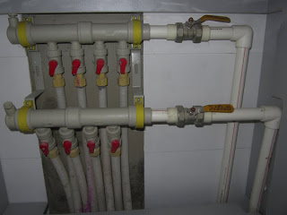 Later that day I had a discussion with my Chinese colleagues about this whole heat situation. While I was now willing to accept the fact that the Worker’s Central Heating Committee of the People’s Republic of China was going to control the day that my place would be warm, I was not yet willing to roll over and let them control the temperature too. You see, my place has no thermostat. Everyone told me the same thing – “no”, no control. I sent a letter to my relocation consultant who at least cleared up the method – radiant floor heating adding that if I was not happy with the temperature or if any major leaks occurred, I should give her a call. I was not satisfied with this and so I asked around until finally I heard a tale, almost certainly apocryphal of valves and pipes, secreted away somewhere in every apartment, giving that tiny bit of control in this totalitarian society. I resolved to find them and following lots of crawling around, knocking on the walls looking for hidden panels, measuring rooms looking for unmapped spaces and peering in closets, I found the valve manifold – it was right there, under the stove.