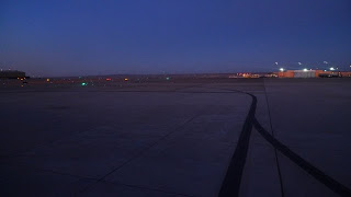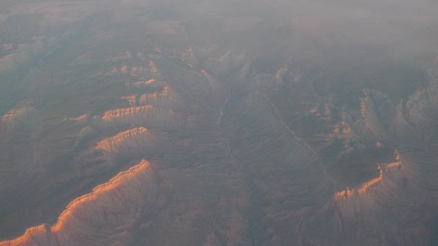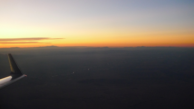Last time I flew out of Albuquerque I had the sublime experience of watching the early glancing rays of the sun catching the tips of the canyons and mountains of New Mexico and Arizona. Unfortunately I didn’t have a camera in hand and so missed recording them. Today I was prepared, taking my first picture of the bleak empty Albuquerque Sunport runway at dawn, a picture that pretty much sums up how I am feeling today. While today’s sunrise show was not as nice as last time’s – it was much hazier today – I did jump up and get a few nice shots of the Grand Canyon at first light. The Captain announced its presence on the right and I jumped out of my seat and headed over there, that row being thankfully empty. I spent a while sitting there soaking it in until the flight attendant who had snuck into the next seat scared the heck out of my by simply being there unexpectedly. She was wondering what I was looking at.