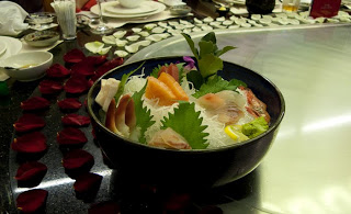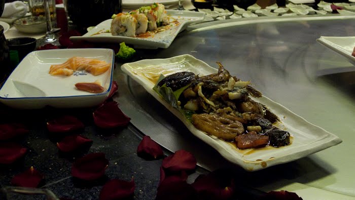 The rooms generally have the same theme – a big round table with the world’s largest Lazy Susan in the middle, a small private bathroom, a sideboard in the corner for serving the beer and utensils and a big screen TV in case anyone is worried about missing their favorite Chinese variety show. Sometimes there is a Karaoke machine in the corner for those customers plowed enough to want to sing after dinner. This room followed the checklist to the letter except that one wall was a beautiful saltwater aquarium and the Lazy Susan was replaced by a big Japanese Teppan grill. Ringing the grill were alternating bands of red and white rose petals – a nice and unexpected touch.