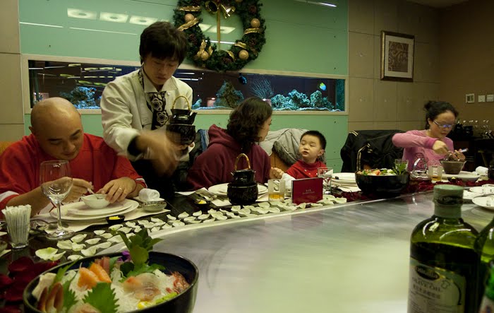 I went out to dinner the other night with some friends. The place was a pretty fancy Japanese restaurant off Renmin Lu in downtown Dalian just across the street and up the block from my old digs at the Shangri La Hotel. This section of town has recently been recast as the luxury shopping district with two new steel and glass-clad modern malls featuring all the big names – Prada, Versace, Armani, etc. I’ve been to them once and the most noticeable thing at that time was their lack of shoppers. While the Chinese have an insatiable hunger for top tier brands, most of the salaries have not yet enabled that kind of consumption. And tonight was no different – it was cold in only the way a damp Manchurian seaport can be in January and the few people on the street were far more interested in when their bus was arriving than in looking at the fancy things in the windows.