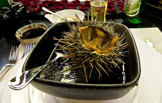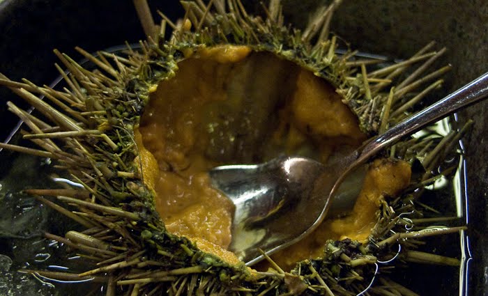 1. Sea Urchin – I’ve had it before and every time I eat it I swear it will be the last. The first one I ever had tasted like a saltwater Mangrove estuary smells at low tide – an interesting blend of salt air, sand and decaying vegetable matter. In the third world you can throw in the slightest hint of untreated sewage. Tonight’s offering was not nearly so foul in taste and was actually pretty mild. If you get past the consistency and color which brings to mind chilled infant poo, you probably could choke it down.